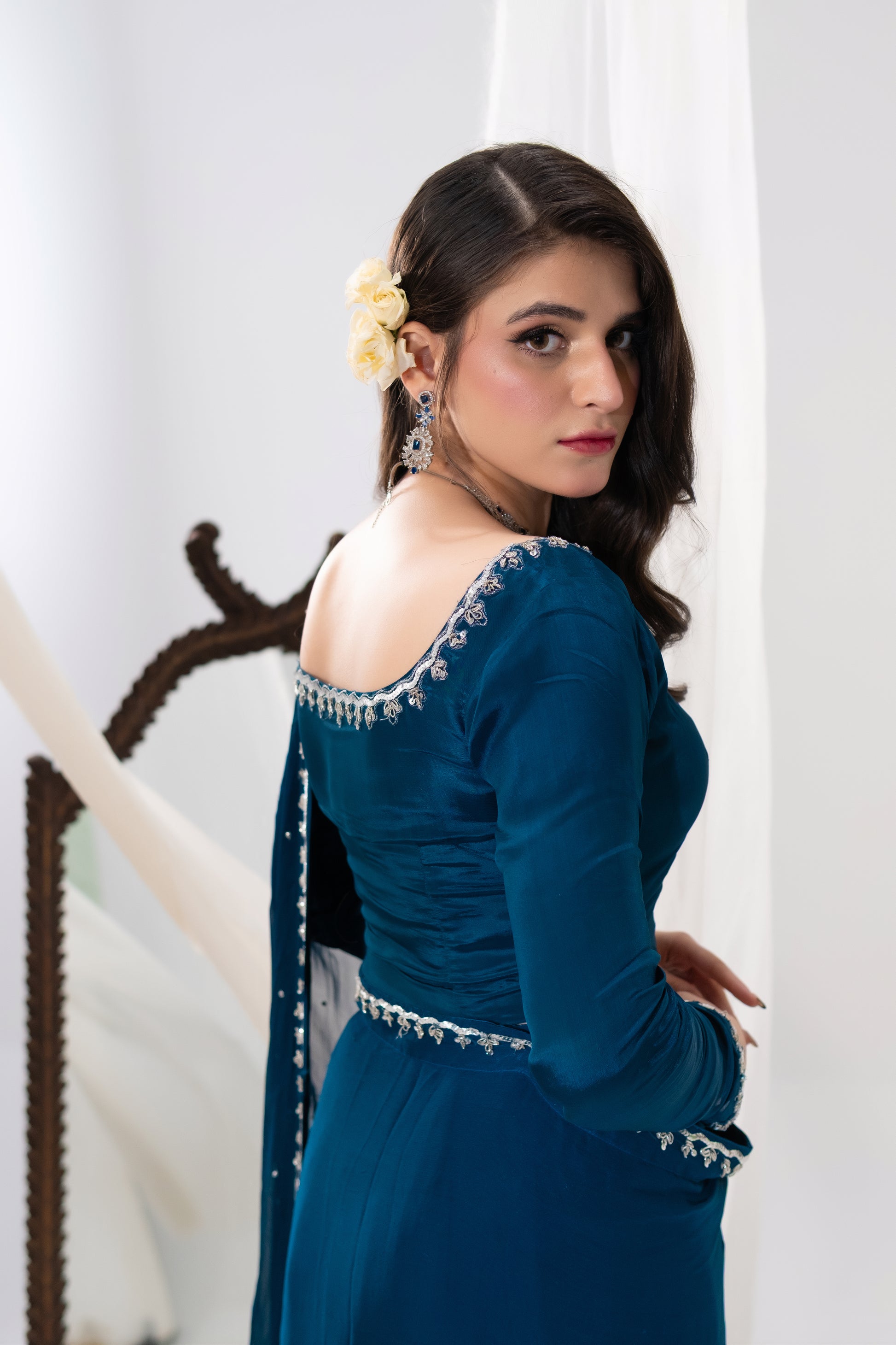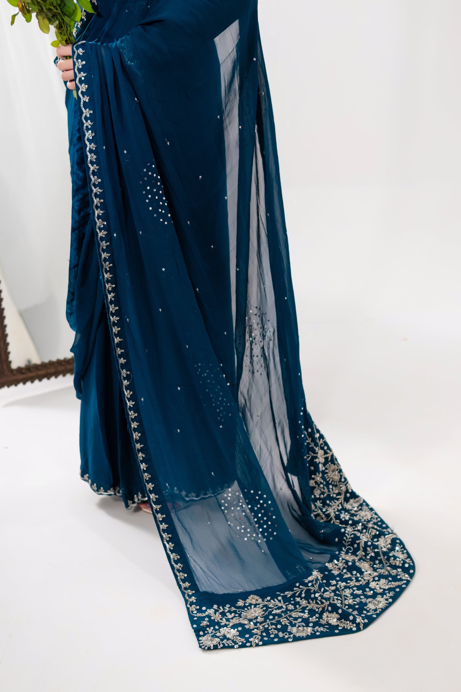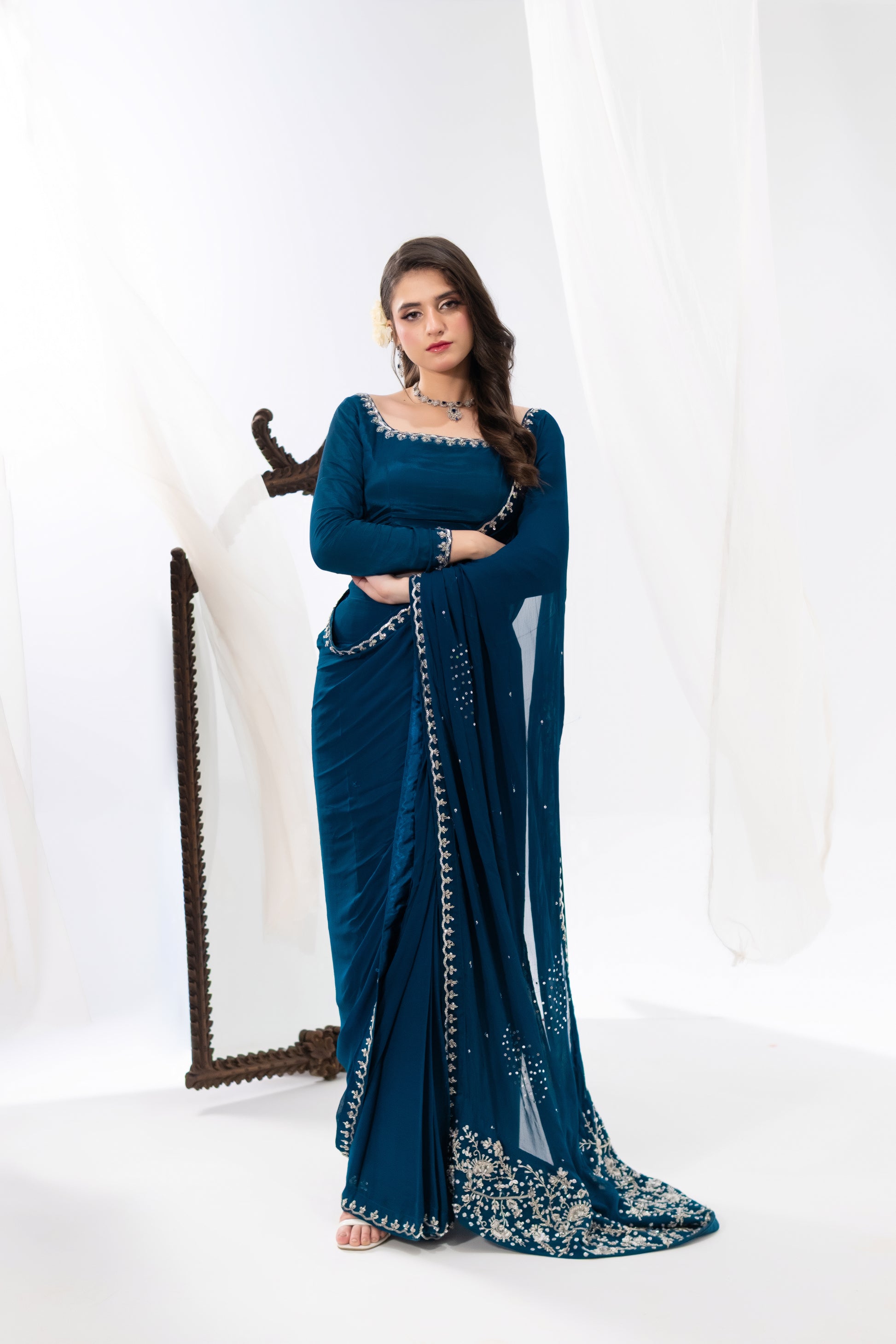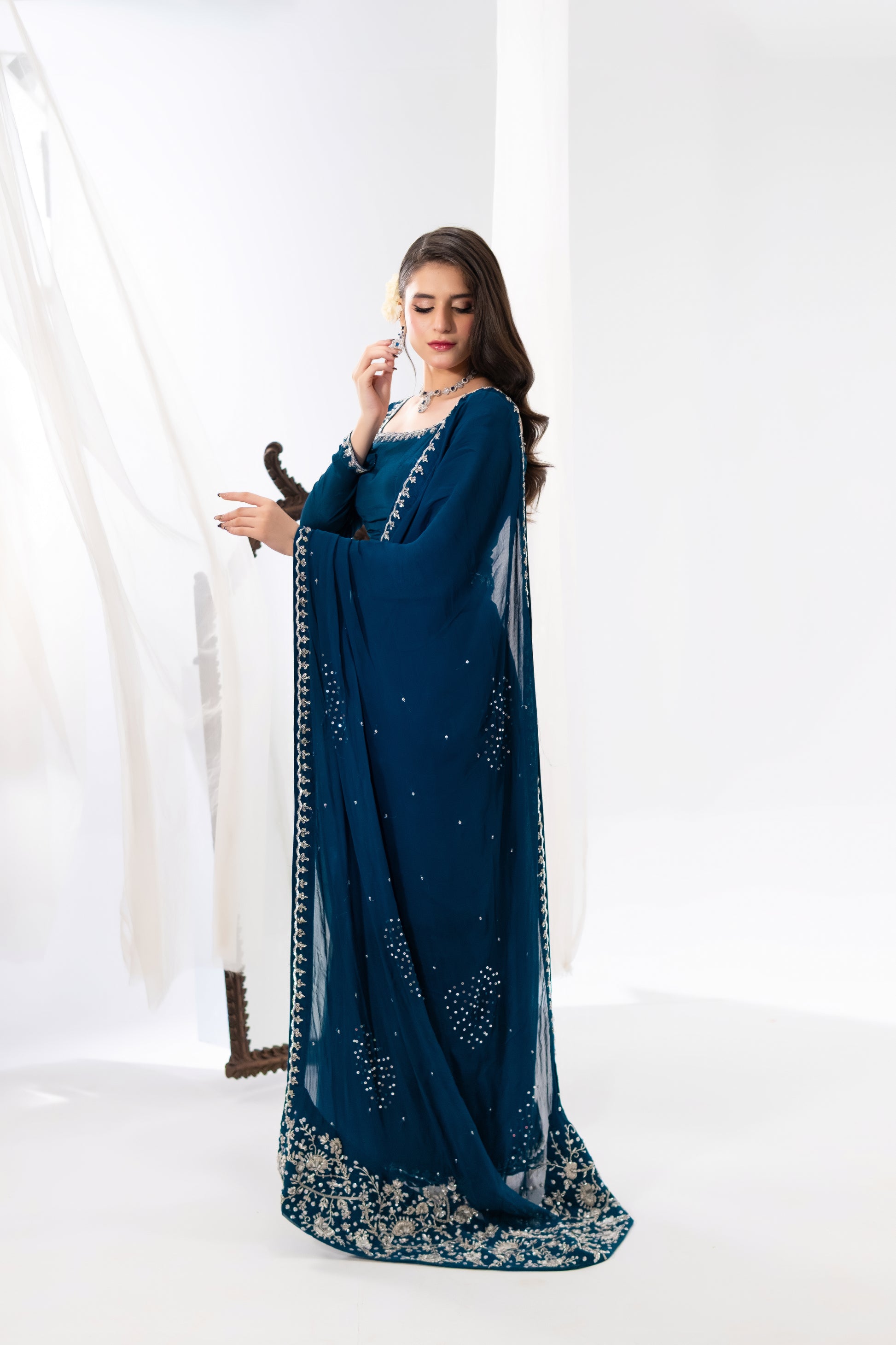 Mahrosh — A deep teal saree crafted for women of timeless grace. The blouse, tailored in premium silk, is framed with intricate hand embroidery in resham, kora, dabka and tilla creating a neckline and sleeve border that glimmers with finesse. The saree drape in luxurious chiffon cascades effortlessly, adorned with delicate sequin work that captures light like scattered stars.