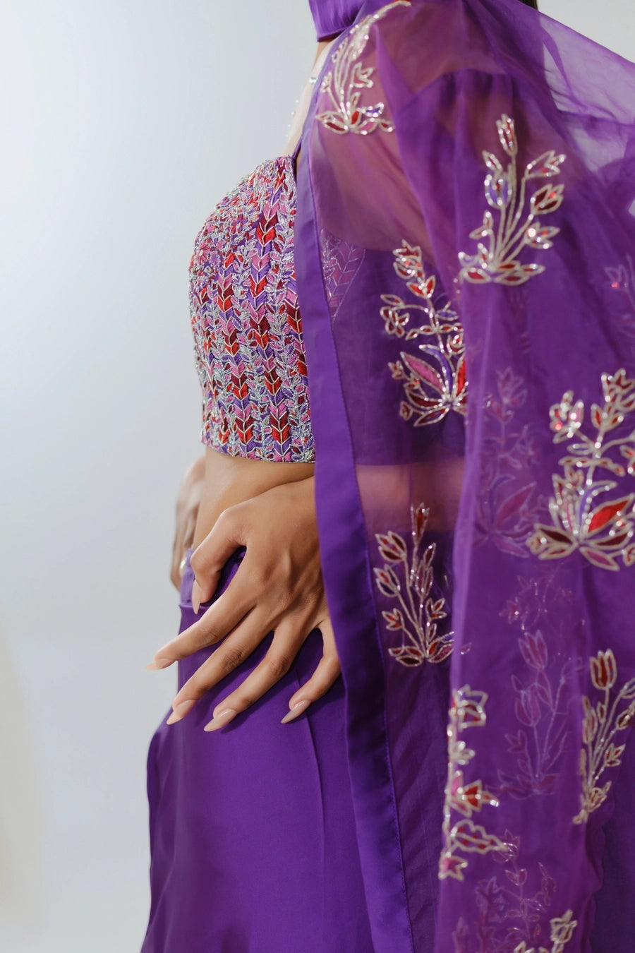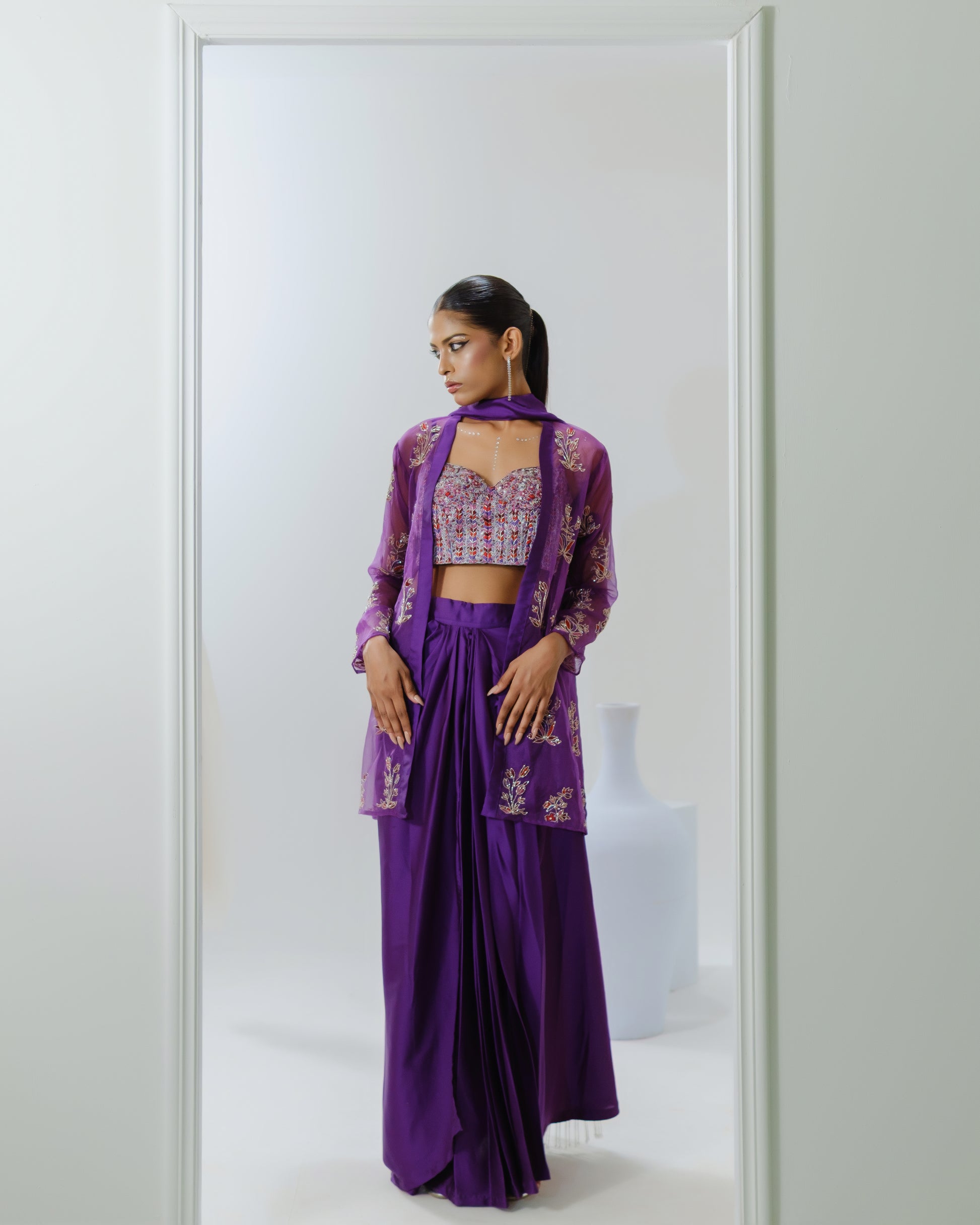 Meher is the symphony of craft and couture — a regal purple ensemble where every thread tells a story. The sheer jacket, blouse, and dropping skirt are each lavishly hand-embroidered with resham, sequins, tilla and other fine embellishments, creating an unbroken harmony of artistry. With every detail shimmering like starlight and every layer flowing with grace, Meher embodies the spirit of a woman who reigns with elegance, strength, and timeless allure.