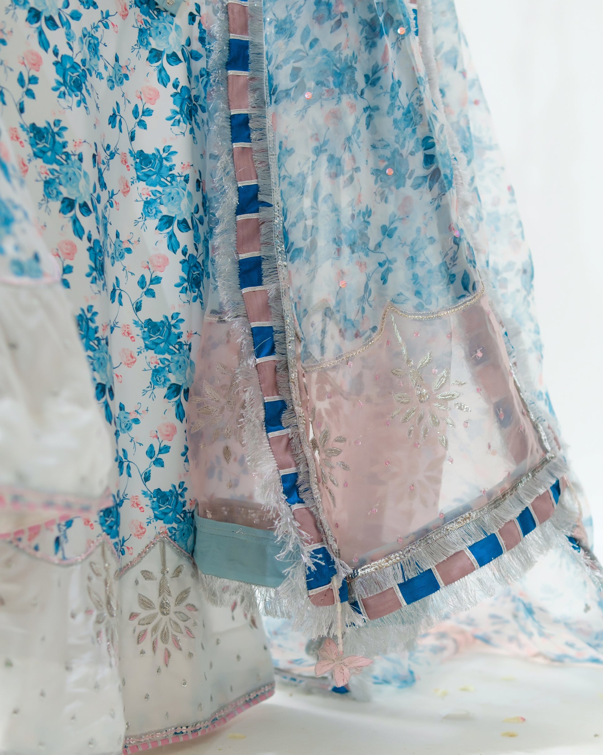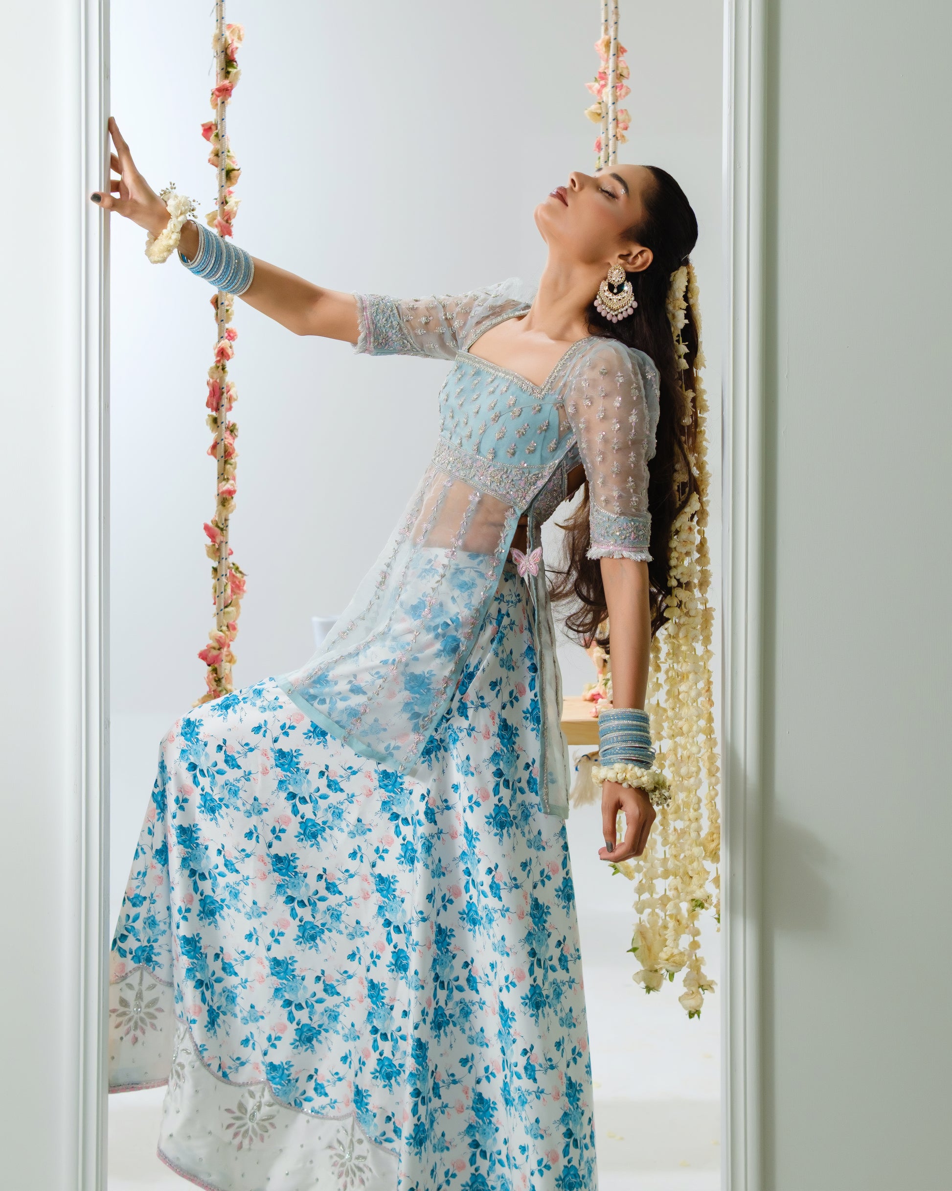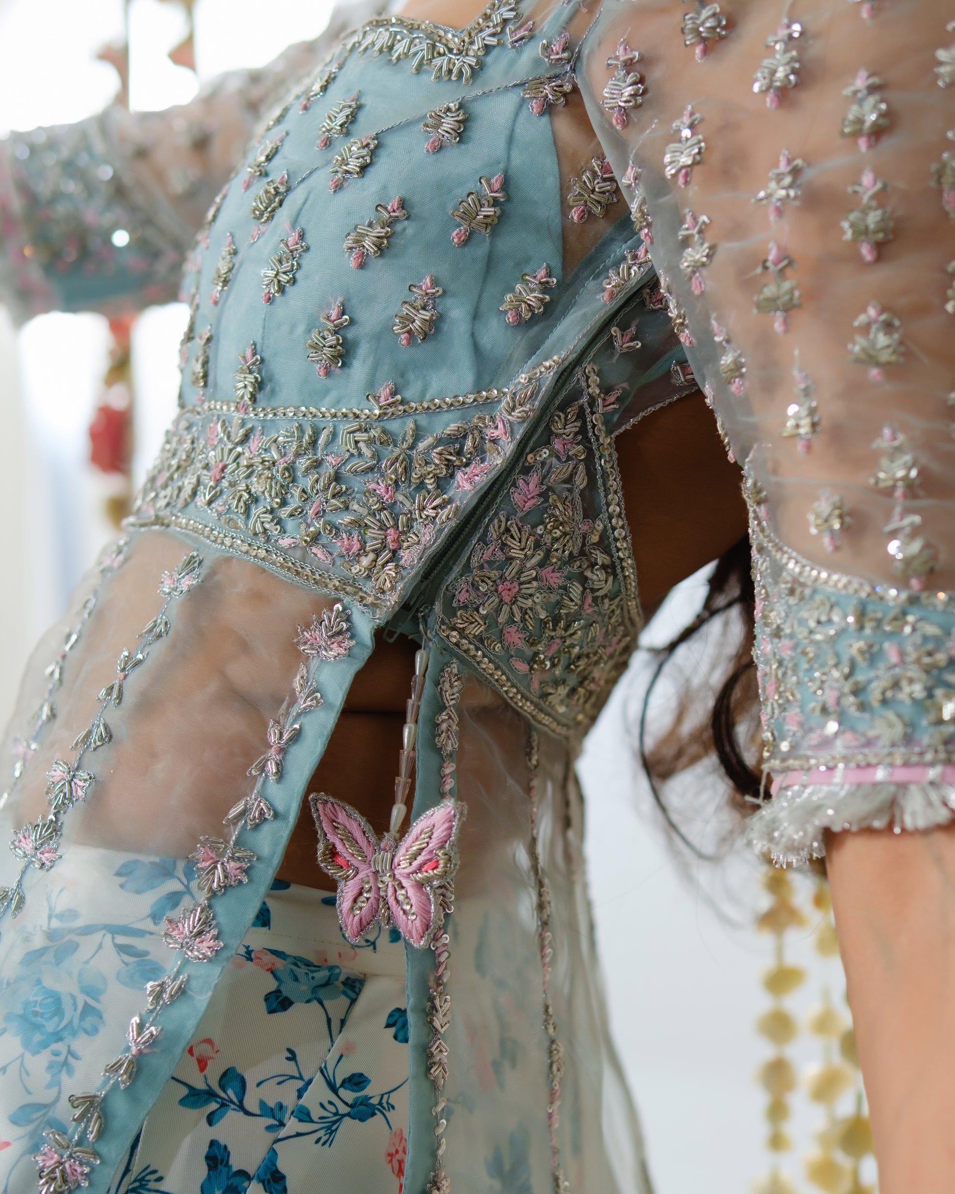 Neelpari is a vision of celestial elegance — a kalidar shirt and dupatta in sheer organza, paired with a lustrous premium silk sharara, all adorned with intricate hand embroidery in resham, tilla, dabka, kora, sequins, and fine embellishments.