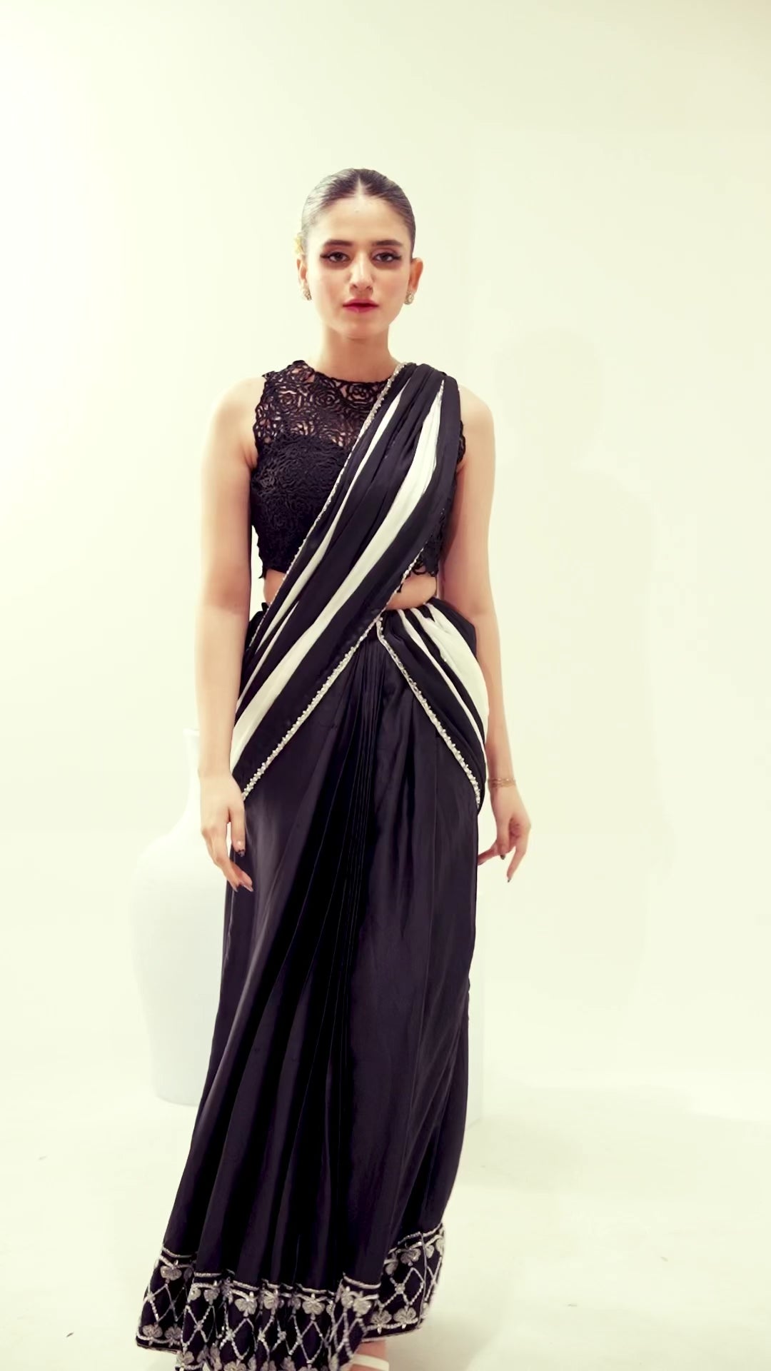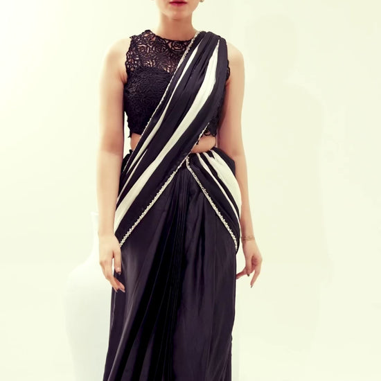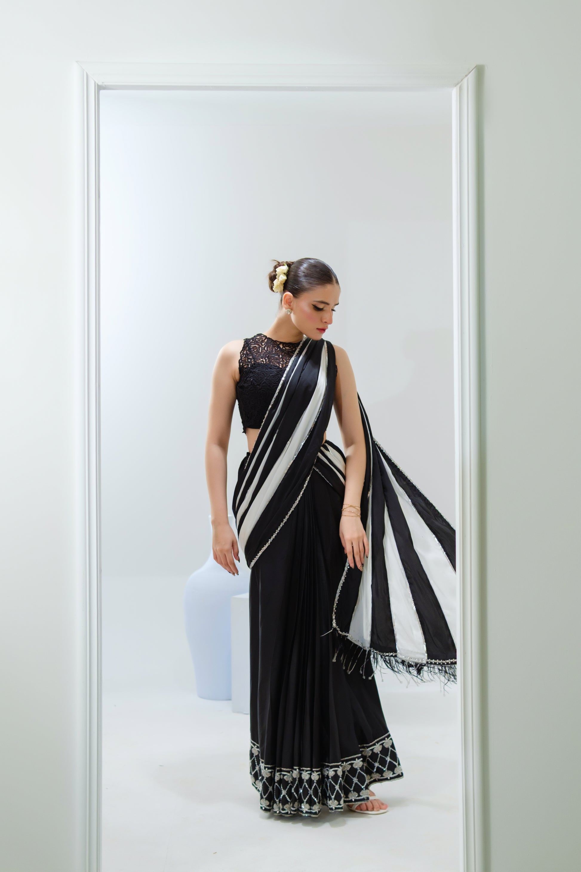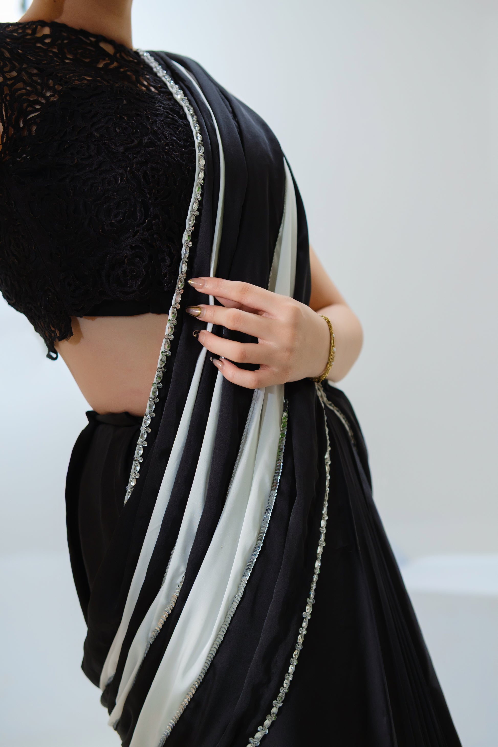 Noor-e-Siyah — A celebration of monochrome luxury. Crafted entirely from premium silk, this saree drapes effortlessly in striking black and ivory contrasts. The borders are adorned with delicate hand embroidery, creating a graceful finish.