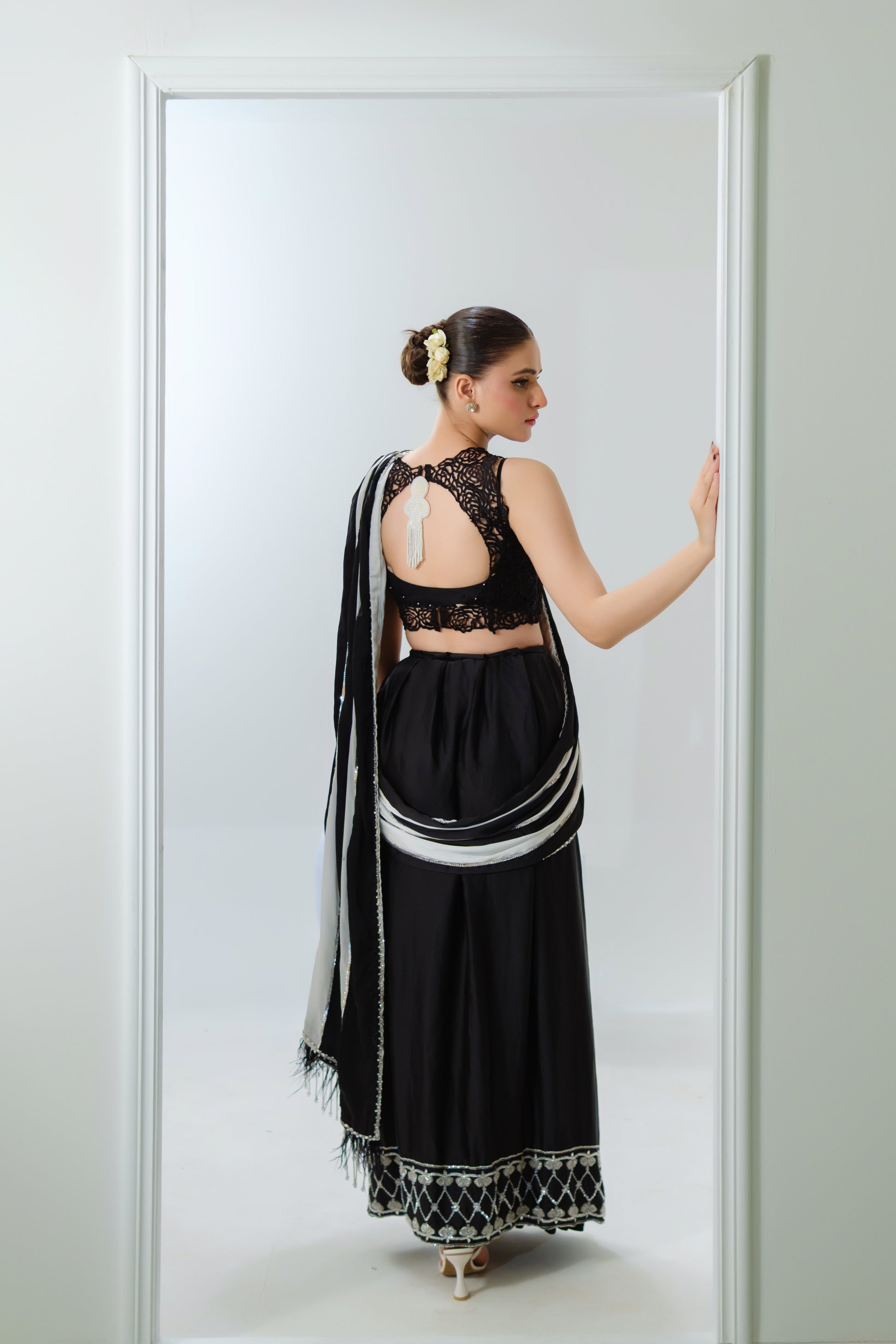 Paired with a handmade cutwork blouse, this ensemble merges craftsmanship with contemporary design, embodying strength, elegance, and timeless sophistication. Perfect for soirées, formal evenings, and celebrations where elegance speaks louder than embellishment.