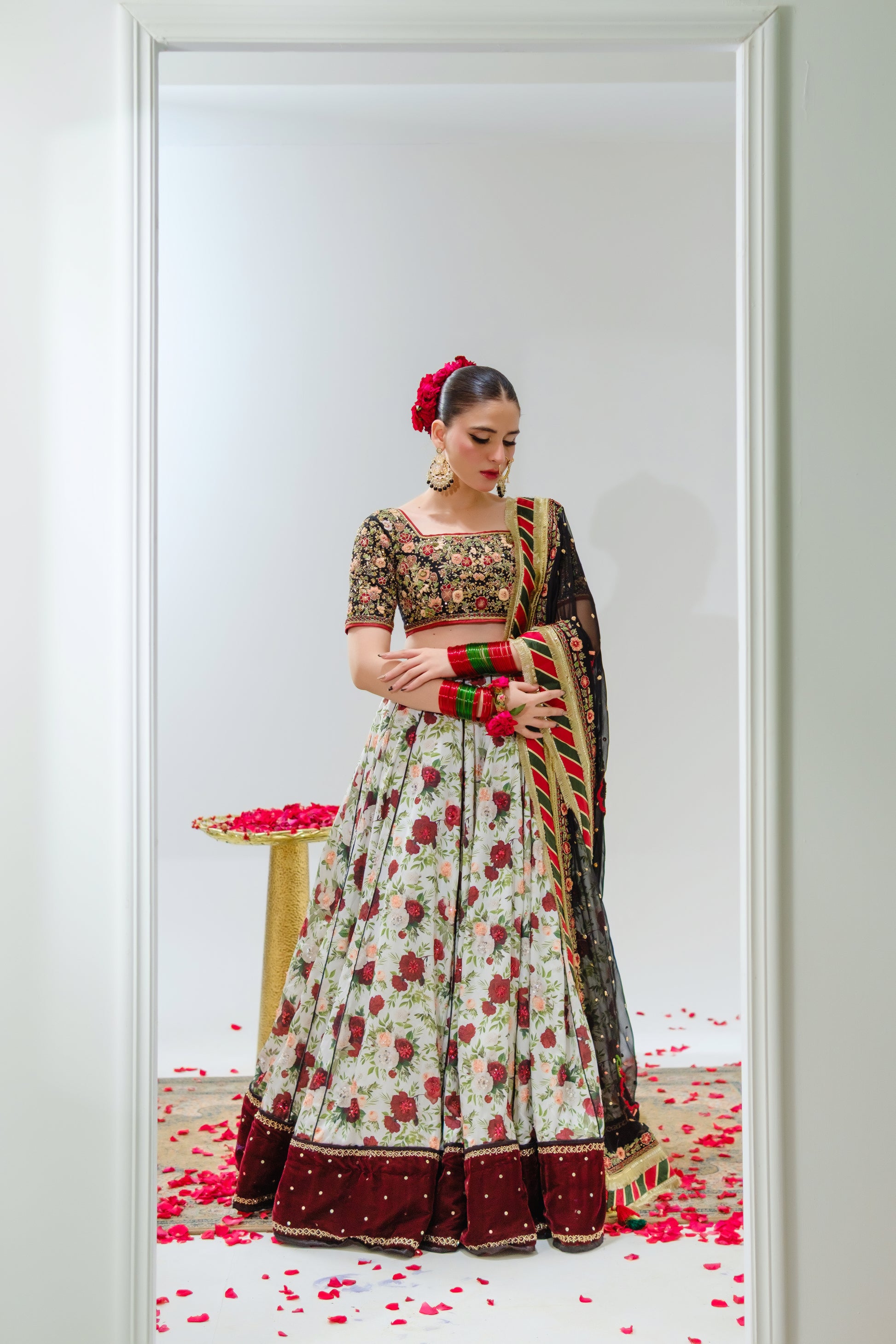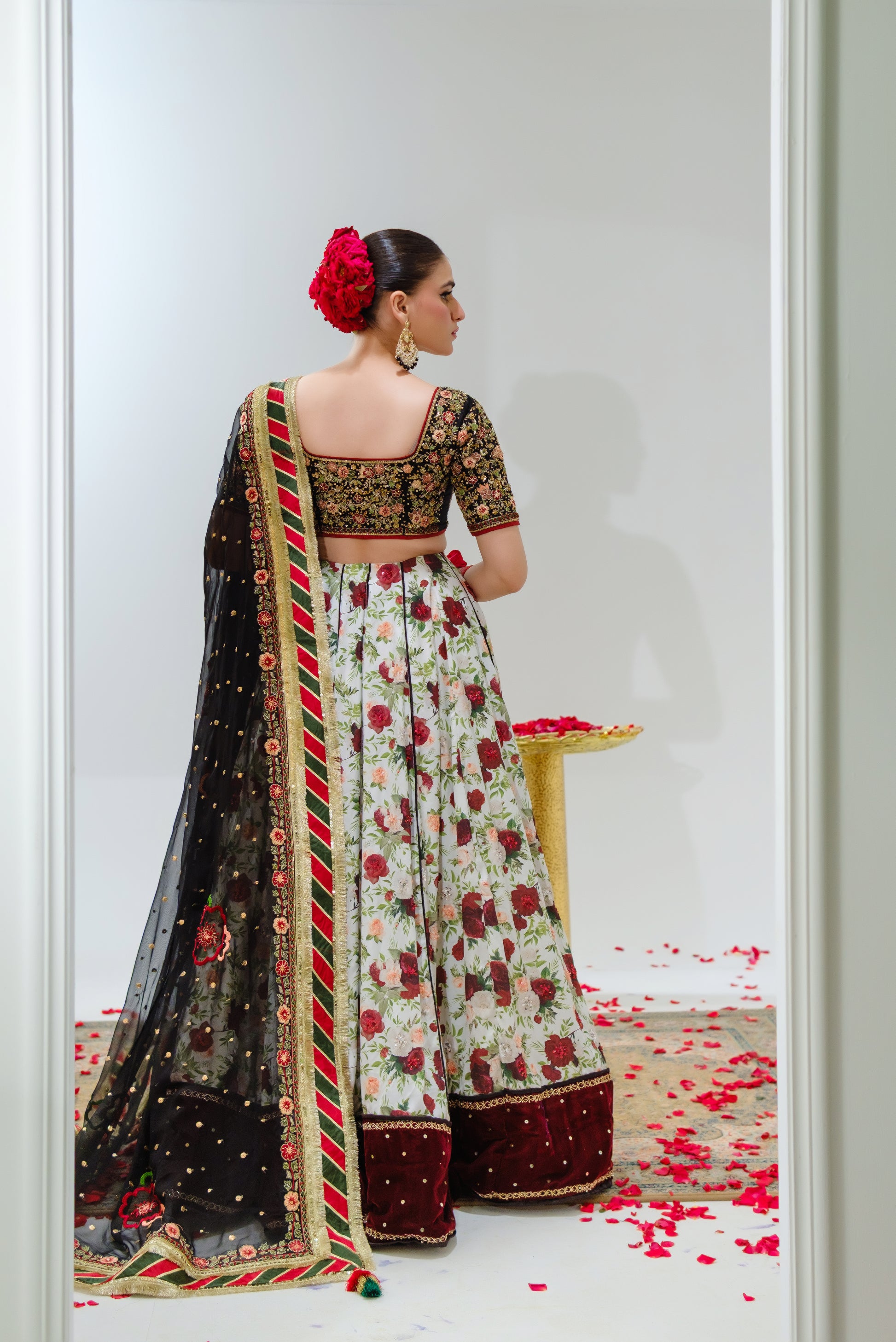 Siyah-e-Zever is an ode to timeless elegance. The premium raw silk choli is meticulously hand-embroidered with resham, tilla, kora, dabka, sequins, and other fine embellishments, forming a rich tapestry of floral artistry. Paired with a fully embroidered silk lehenga and a delicately adorned chiffon dupatta, this ensemble fuses eastern grandeur with contemporary finesse — a true embodiment of luxury couture.”